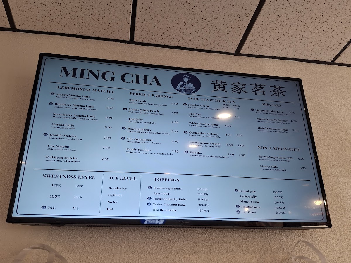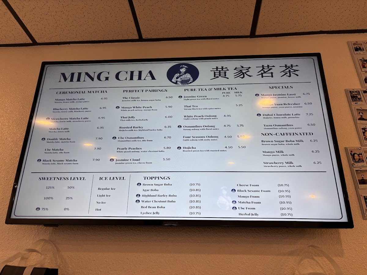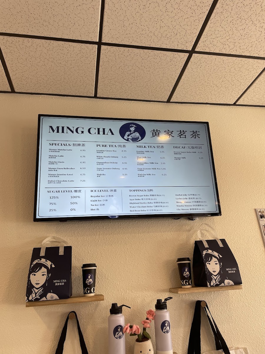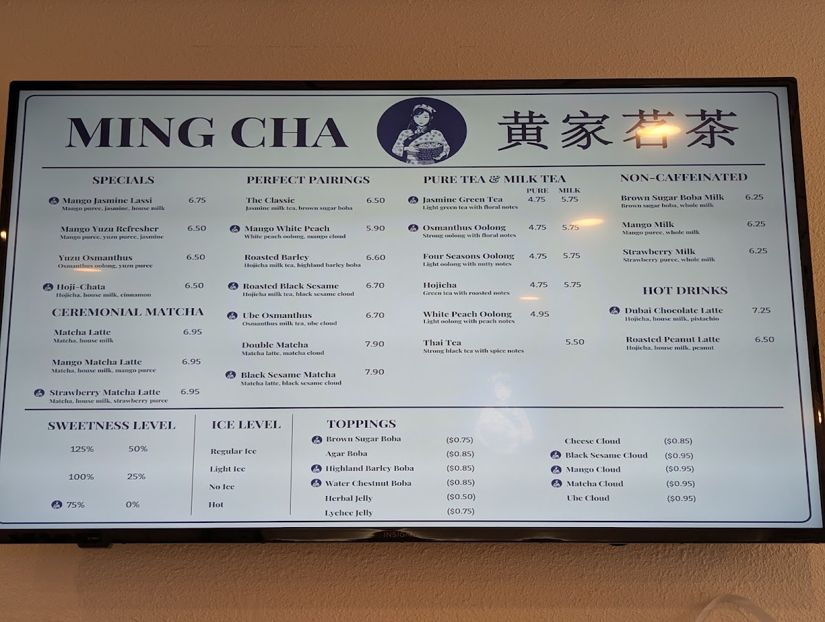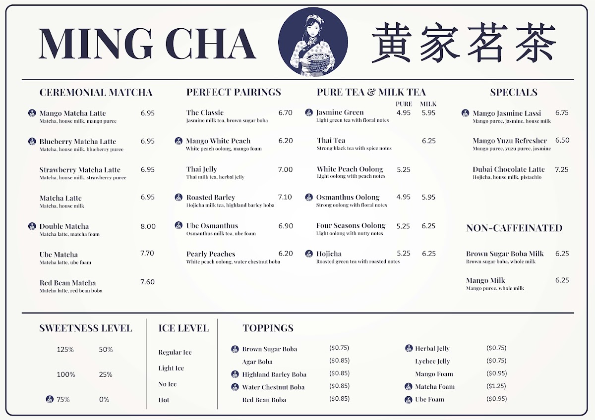 The menu at Ming Cha offers a delightful variety of beverages and desserts that cater to a wide range of tastes. For those seeking a refreshing drink, the Decaffeinated section features comforting options like Taro Milk, Mango Milk, Brown Sugar Milk, and Strawberry Milk. If you're in the mood for something sweet, the Desserts menu offers indulgent treats such as Matcha Sago Pudding, Black Sesame Sago Pudding, and Mango Sago Pudding. For fans of matcha, the Ceremonial Matcha section includes options like the Mango Matcha Latte, Strawberry Matcha Latte, and the classic Matcha Latte. Tea enthusiasts can enjoy a selection of Pure Teas like Osmanthus Oolong, Four Season Oolong, and Jasmine Green Tea, or explore the Specials menu with creative options such as the Lychee Osmanthus, Mango Jasmine Lassi, and Roasted Peanut Latte. For a unique twist, the Foam Tops section features the bold flavors of Roasted Black Sesame, Double Matcha, and Mango White Peach. The Milk Tea offerings include favorites like White Peach Milk Tea, Osmanthus Milk Tea, and Earl Grey Milk Tea. Additionally, the Fruit Teas are a refreshing choice, with options like Yuzu Grapefruit and Mango Yuzu. Among the Most Popular drinks are the Double Matcha, Jasmine Milk Tea, and Osmanthus Milk Tea, all known for their exceptional flavor combinations. With such a diverse menu, Ming Cha provides something for everyone, from creamy milk teas to fruity infusions and decadent desserts.