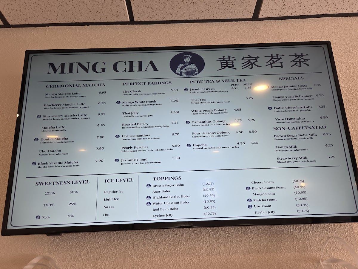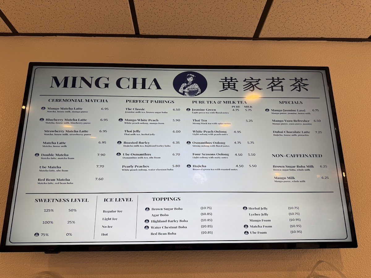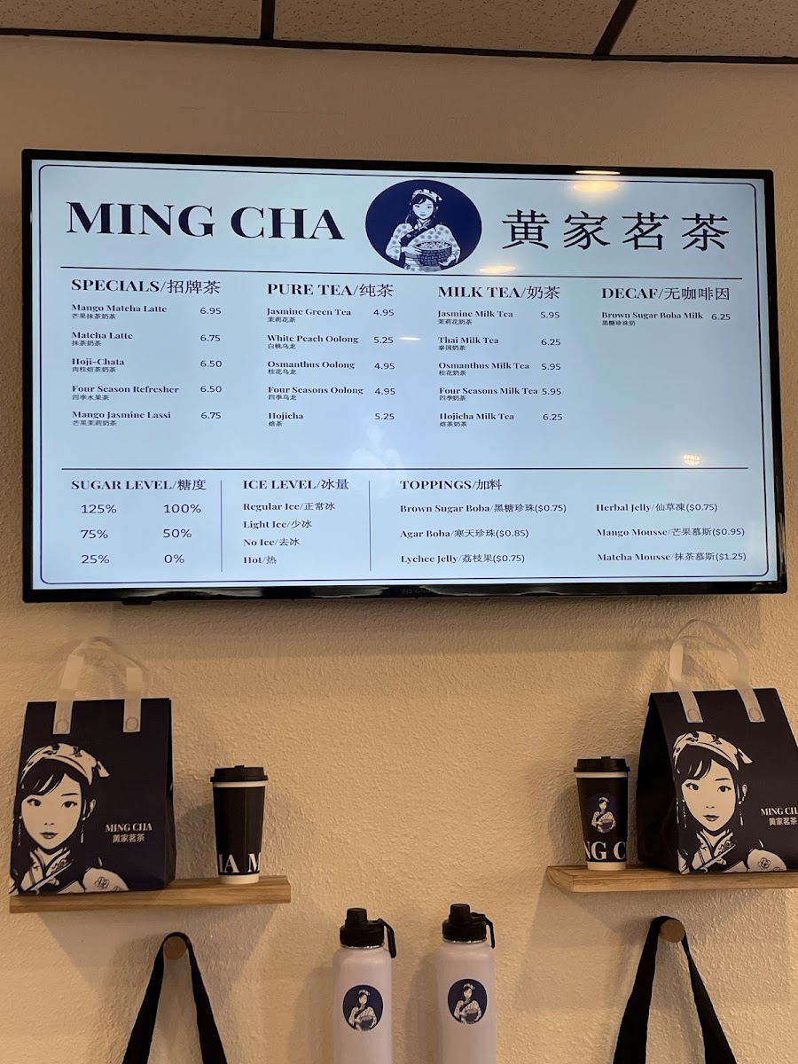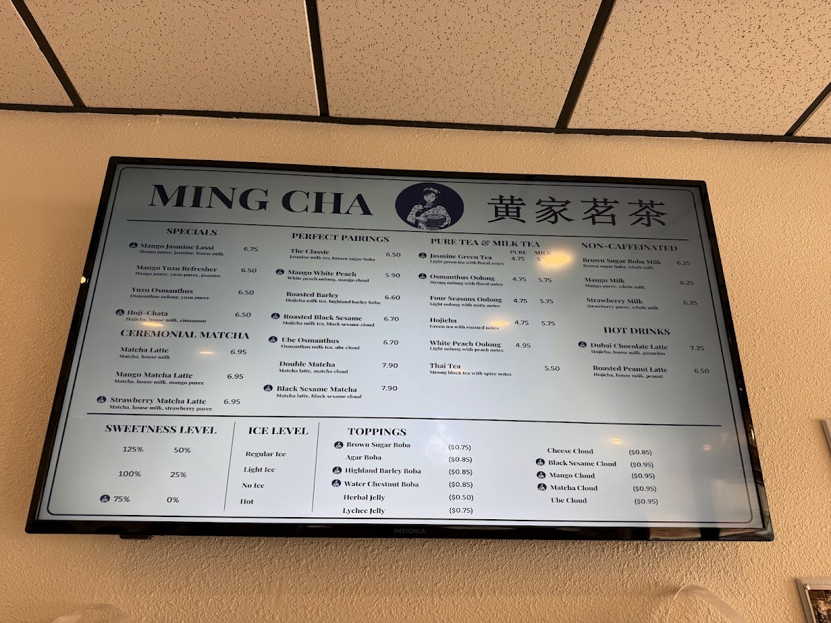 The menu at Ming Cha offers a delightful variety of beverages and desserts that cater to a wide range of tastes. For those seeking a refreshing drink, the Decaffeinated section features comforting options like Taro Milk, Mango Milk, Brown Sugar Milk, and Strawberry Milk. If you're in the mood for something sweet, the Desserts menu offers indulgent treats such as Matcha Sago Pudding, Black Sesame Sago Pudding, and Mango Sago Pudding. For fans of matcha, the Ceremonial Matcha section includes options like the Mango Matcha Latte, Strawberry Matcha Latte, and the classic Matcha Latte. Tea enthusiasts can enjoy a selection of Pure Teas like Osmanthus Oolong, Four Season Oolong, and Jasmine Green Tea, or explore the Specials menu with creative options such as the Lychee Osmanthus, Mango Jasmine Lassi, and Roasted Peanut Latte. For a unique twist, the Foam Tops section features the bold flavors of Roasted Black Sesame, Double Matcha, and Mango White Peach. The Milk Tea offerings include favorites like White Peach Milk Tea, Osmanthus Milk Tea, and Earl Grey Milk Tea. Additionally, the Fruit Teas are a refreshing choice, with options like Yuzu Grapefruit and Mango Yuzu. Among the Most Popular drinks are the Double Matcha, Jasmine Milk Tea, and Osmanthus Milk Tea, all known for their exceptional flavor combinations. With such a diverse menu, Ming Cha provides something for everyone, from creamy milk teas to fruity infusions and decadent desserts.
